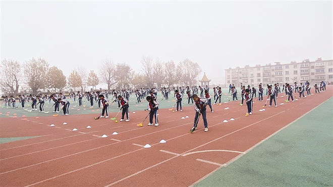 学校开展旱地冰球课间操。大连新闻传媒集团记者徐媛媛 摄