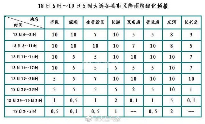 降雨预报:预计18日早晨至19日上午全区有大雨到暴雨,降雨量30-70毫米,其中普兰店和庄河的部分地区暴雨到大暴雨,降雨量70-120毫米,小时最大降雨量10-20毫米。主要降雨时段在18日早晨至19日凌晨,19日上午降雨逐渐减弱停止。