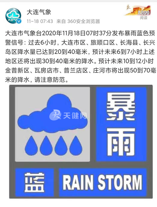11月18日7时37分,大连市气象台发布暴雨蓝色预警信号。
