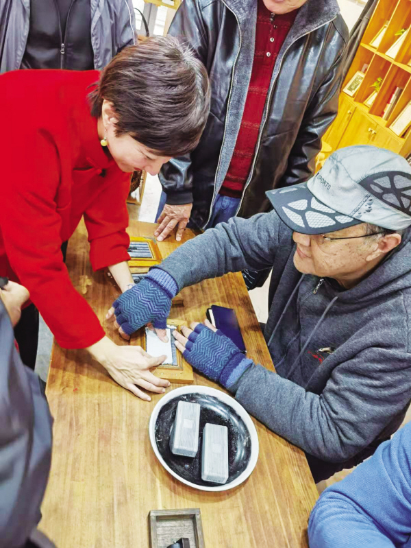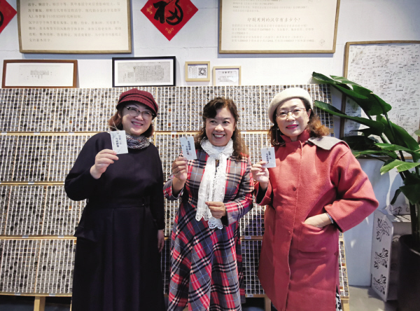 大家落座后,时光印记的吴店主便用PPT为大家细致地讲解汉字的起源与发展演变,让大家了解到活字印刷术的历史及意义……老友们听得聚精会神,还不时拿出手机拍照记录。学习之后,大家便在店主的指导下开始动手体验了,体验台上是早已准备好的墨盒、墨刷、墨滾和已经手工排版好的铅字,把油墨轻轻刷在凸起的汉字表面,覆盖上“时光印记”体验馆为大家准备好的书签,再用手指一个字一个字的使劲按压,让油墨均匀充分地附着在纸上,掀开书签时,一首古诗词伴着墨香跃然纸上。同时,大家还拿出备好的枫叶、银杏叶等树叶各种DIY创作。热情的店主还教大家如何用微信公众号中的字库,检索到自己需要的字。现场,一位参加活动的读者还亲手为老公和女儿印制别有意义的活字印刷生日礼物。读者蔡胜利说:“这次活动,让我由衷地感到中华文明博大精深,活字印刷术不仅新鲜有趣,体验之后,让我内心里还充满了中国人的自豪和使命感。”