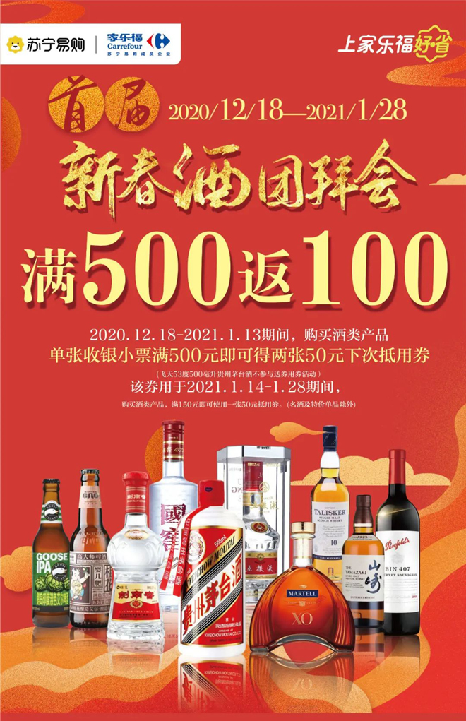 这些甘洌清正、空杯留香的白酒,都可在苏宁家乐福酒团拜会上购买到,当然作为首届“新春酒团拜会”的举办方,家乐福也是对消费者拿出了慢慢的诚意。自12月18日至1月28日,购买酒类商品满500元返100元下次抵用券(特殊商品除外)。