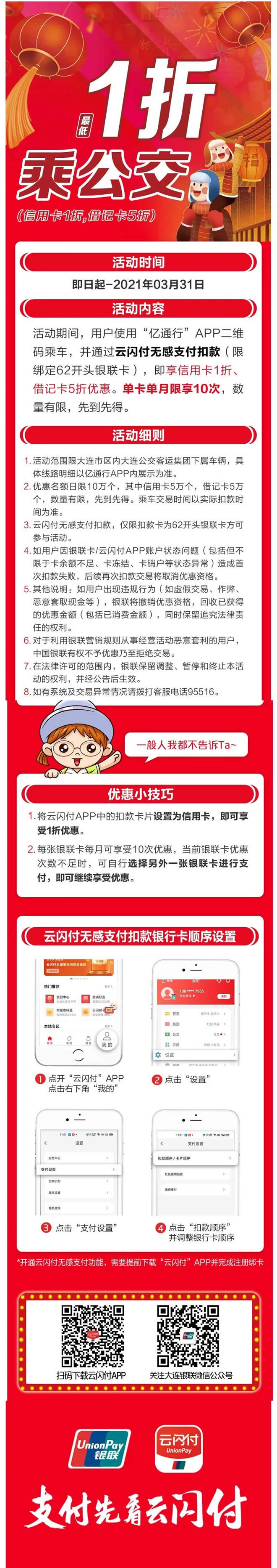 信用卡1折&借记卡5折,每卡每月10次优惠,换卡接着享,云闪付可查名额。