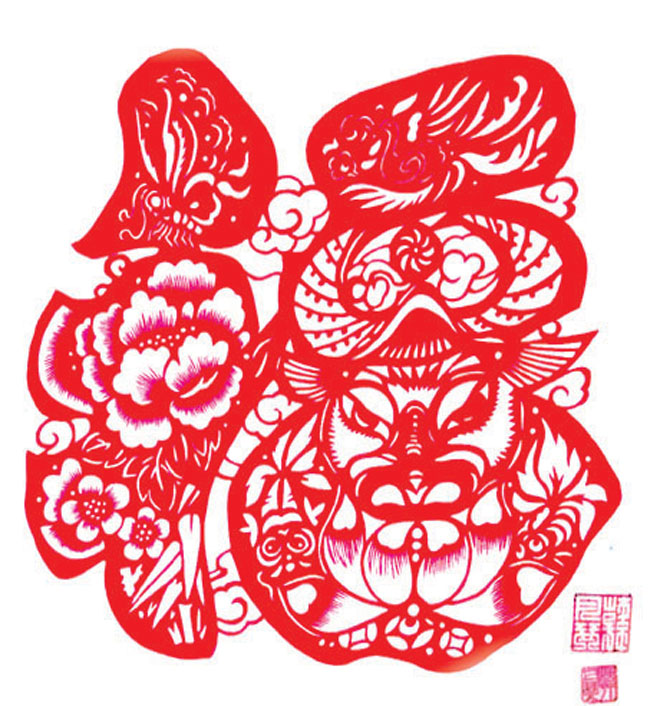 师承家传,左手用剪,剪随心动,形神兼备。在韩月琴家中,她现场盲剪了一幅牛年剪纸,不到一分钟的时间,一幅对称的“寿牛”跃然纸上,昂扬的牛角,牛鼻子被剪成一个“寿”字寓意着年年有余的小鱼儿将戏牛图赋予更加祥瑞的内涵。“图必有意,意必呈祥,比喻、象征、谐音、文字等传统的寓意手法巧妙地运用,信手拈来。”记者深深地为韩月琴的非遗绝技所折服。