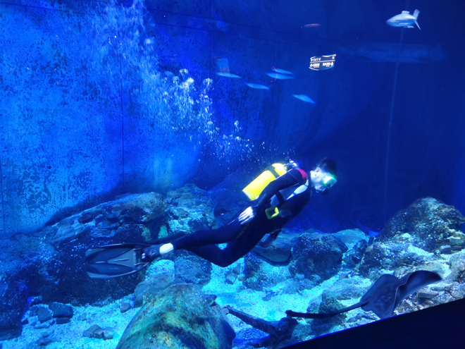 “这些海洋动物就像我的家人一样融入到我的生活中。”荆湛指着一条全身赤红带有黑色条纹的藩王告诉记者,自己给它起名叫“吴三桂”。也许有人会认为鱼的记忆只有7秒,但随着饲养与相处的时间变长,荆湛相信鱼类有自己的智商和情感。比如馆内的六班刺豚,四线笛鲷,黄瑶,黑鳐都认识人,看见驯养员有的会向你喷水,有的会追着你游动,有的听见脚步声就会游到水面。“日常工作潜水时我经常想,如果有的选择,我还挺想变成一条鱼去试试生存。”荆湛说道。