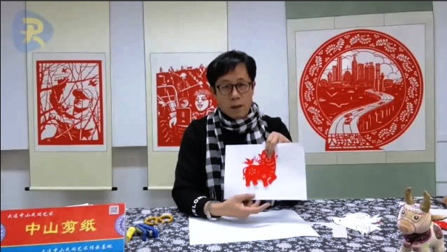 中山民间剪纸艺术代表性传承人毕务福提醒大家,在剪纸中一定要注意,要先里后外、先小后大、先难后易,要求剪口圆滑流畅、到位。因为这幅作品镂空的地方很多,所以要先学会扎眼。剪刀和纸张的角度成90度角,用食指和中指托住纸张,用剪子尖在纹样处轻轻转动剪刀,当剪尖扎透纸张后,用剪尖一点一点向前剪,剪尖的使用也是剪纸中的基本功训练之一。