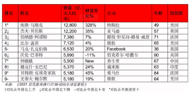 2021胡润全球富豪榜前十。