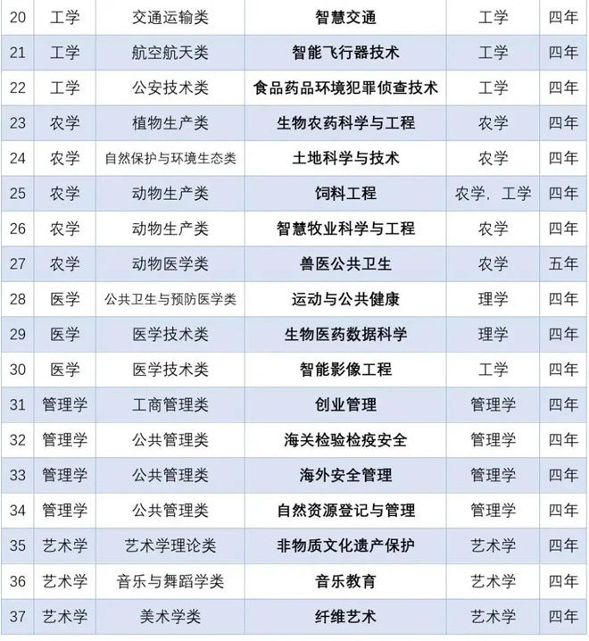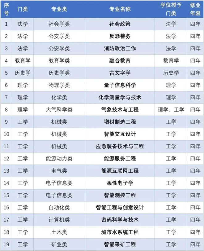 根据高等学校专业设置与教学指导委员会评议结果,确定了同意设置的国家控制布点专业和尚未列入专业目录的新专业名单,融合教育、古文字学、量子信息科学、能源互联网工程、智慧交通、智能飞行器技术等37个新专业列入普通高等学校本科专业目录。