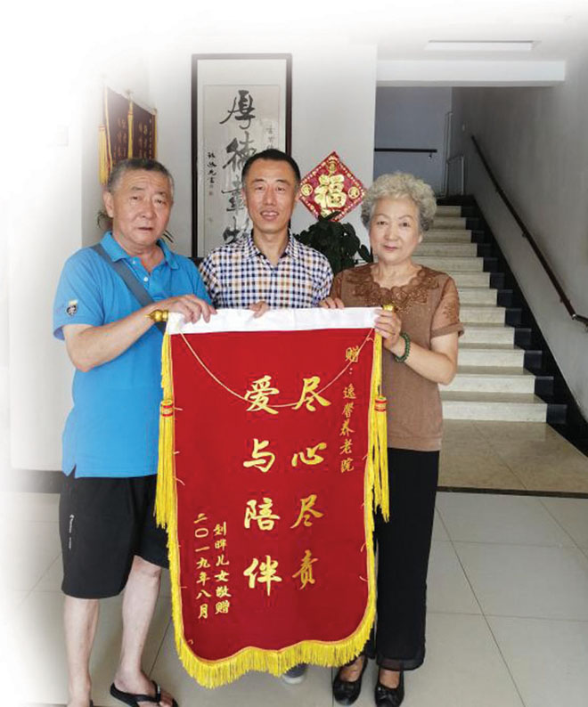 老人家属(左右)给王殿伟(中)送来锦旗。