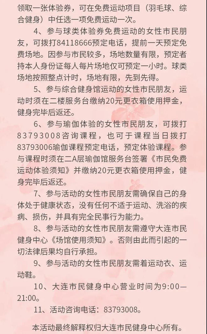 为迎接第111个“国际妇女节”的到来,大连体育中心将于3月8日开展面向女性市民的场馆免费体验活动,让女同胞在活力、健康、温馨、舒适的环境中度过节日。有意向前来健身的女性市民,请提前一天拨打电话预定场地,预定后请携带身份证登记后入场健身。