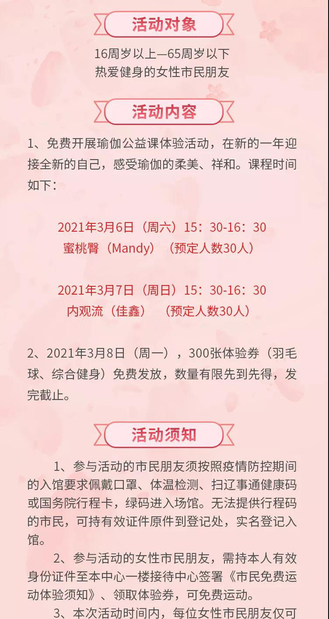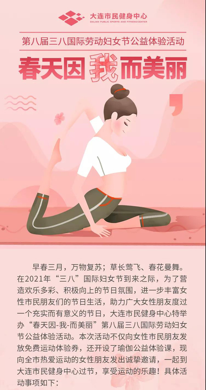 2021年“三八”国际妇女节,大连市民健身中心将举办“春天因我而美丽”第八届三八国际劳动妇女节公益体验活动。活动将向女性朋友发放免费运动体验券,还将开设瑜伽公益体验课,现向热爱运动的女性朋友发出邀请,详情请查看图片。(大连市民健身中心)