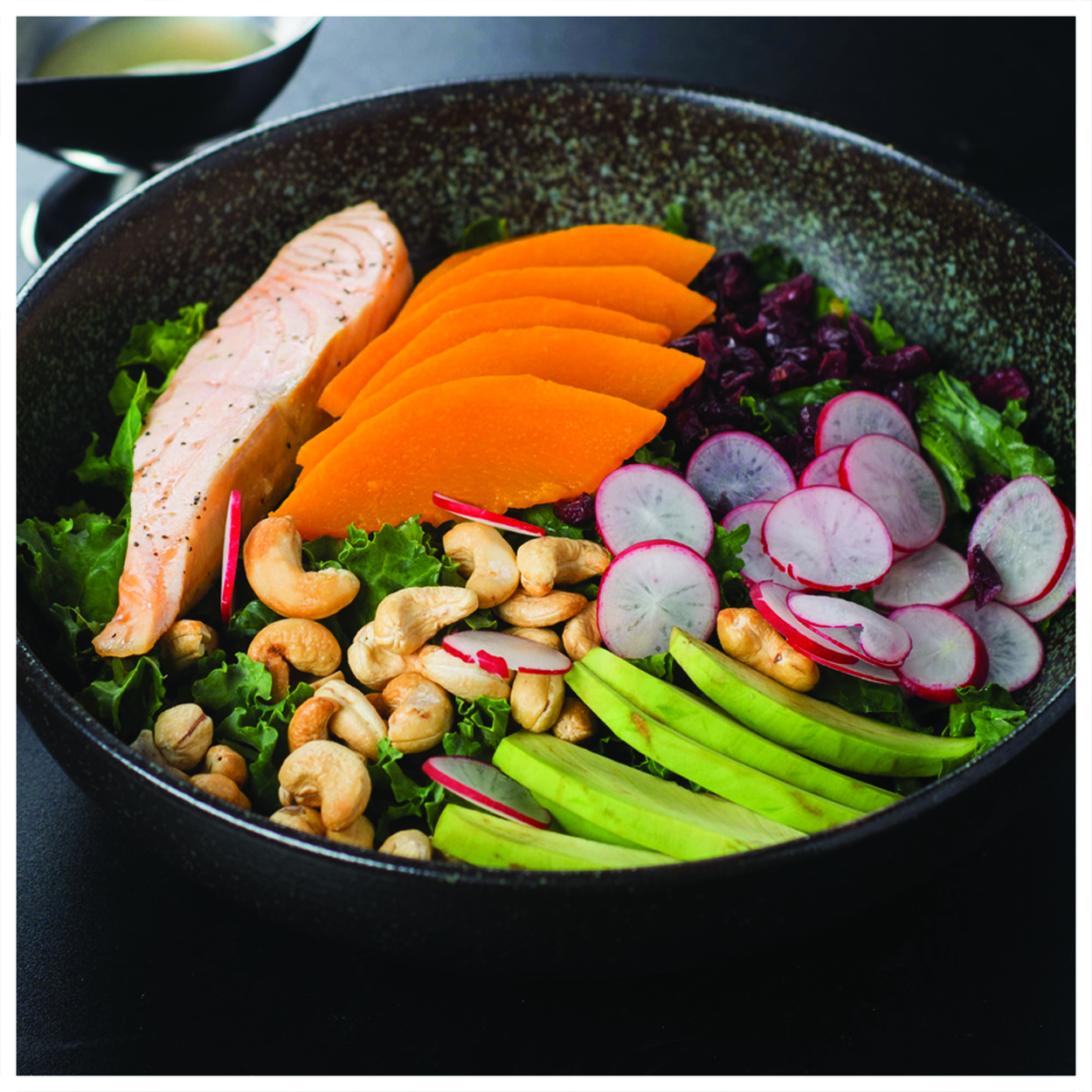 2.在沙拉碗内垫底放入羽衣甘蓝、紫叶生菜和苦苣,加入特色芥末酱,再加适量黑胡椒及海盐,抓拌均匀,再铺上牛油果片、樱桃萝卜片、南瓜条,然后放入三文鱼肉,撒上腰果、蔓越莓。