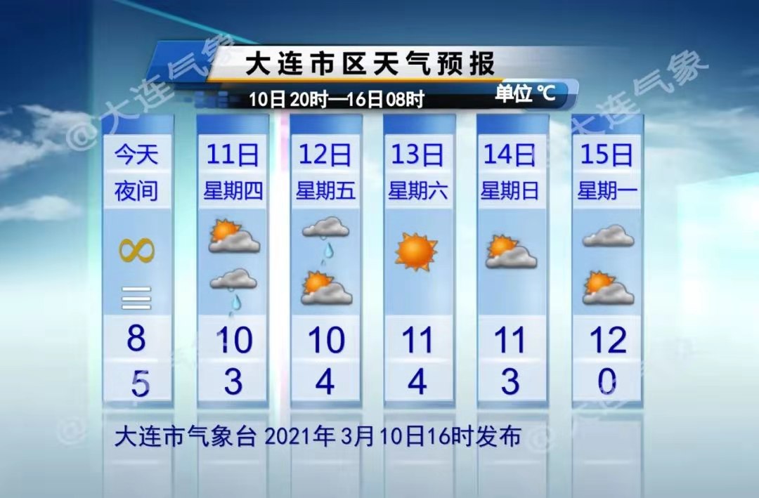 预计明天我市上空的云量会有所增多,下午天气还会进一步转阴,部分地区有小雨天气,提醒大家明早出门最好备上把雨伞。虽然明天会出现降雨,但本次天气过程并没有配备冷空气,所以雾和霾不会得到明显的改善,天气情况依然不适合大家进行户外活动,尤其是敏感人群,一定要尽量减少外出。明天的气温和今天相比,变化不大,除了长海气温稍低之外,大部分主要站点的最高气温都在8~11℃之间。