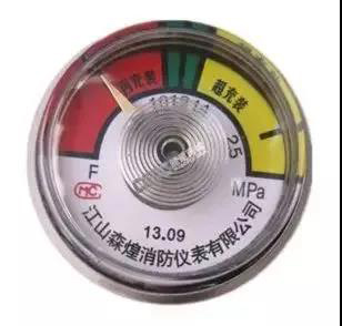灭火器压力表分为红、黄、绿三个区域,压力指针达不到绿色区域的为不合格产品。压力指示器的种类应与该灭火器的种类相符,充装量大于3公斤的灭火器应配有喷射软管;灭火器应安装保险销,且保险销的铅封(塑料带、线封)应完好无损,否则为不合格产品。