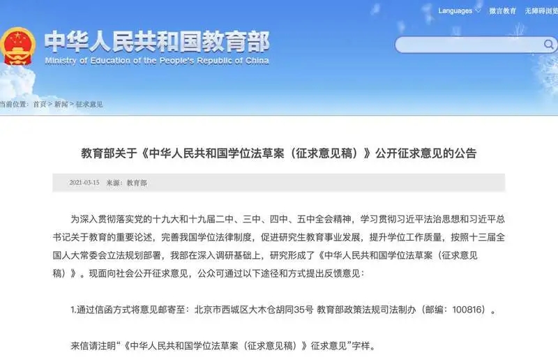 3月16日,记者从教育部获悉,教育部发布关于《中华人民共和国学位法草案(征求意见稿)》公开征求意见的公告。