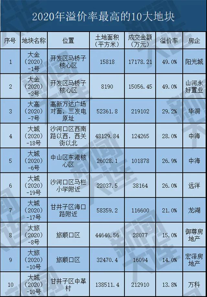 中山区、沙河口区、高新区住宅地块溢价率较高,金普新区住宅地块2020年整体溢价率虽然不高,但金马路核心地块的溢价率达到了49%,为全市最高。