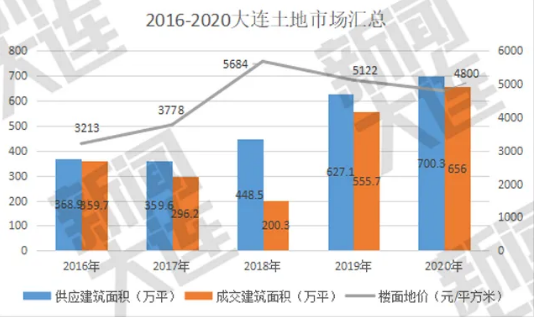 2020年大连成交经营性用地83宗,占地面积508万平方米,拟建筑面积656万平方米,同比上涨18%,为近五年最高。楼面地价为4800元/㎡,同比下降6.3%。