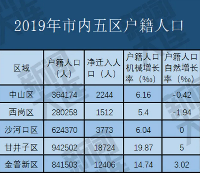 2019年市内五区户籍人口全部为净迁入状态,全年累计从省内外净迁入38659人。其中,甘井子区、金普新区户籍人口机械增长率、自然增长率都位居前列,人口聚集能力更加突出。