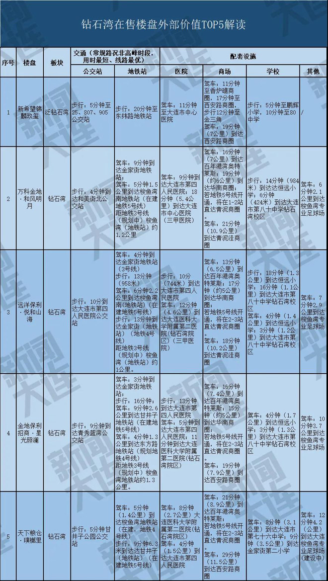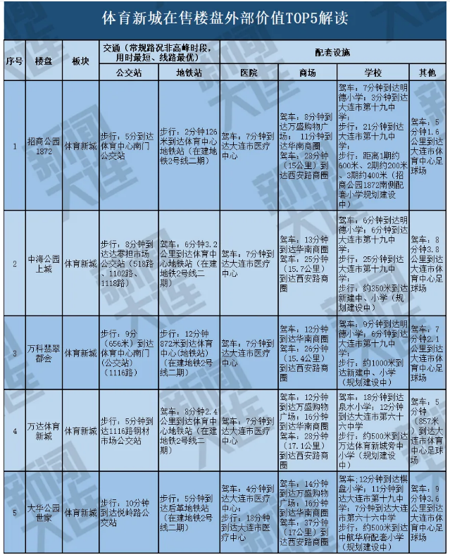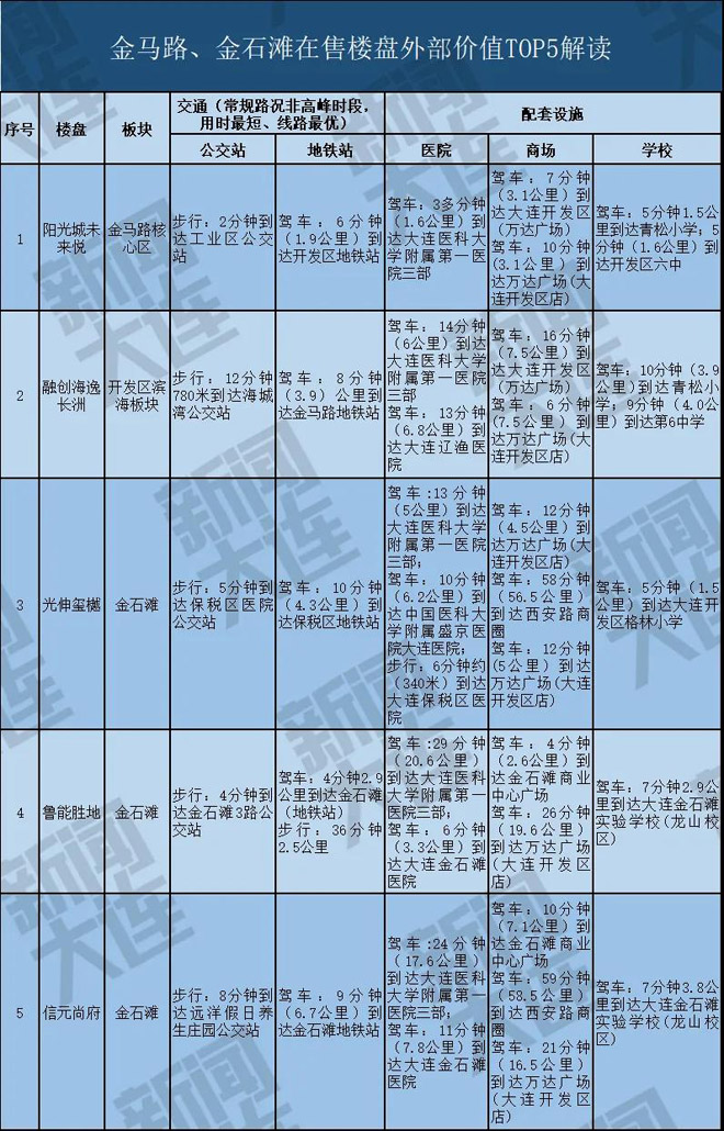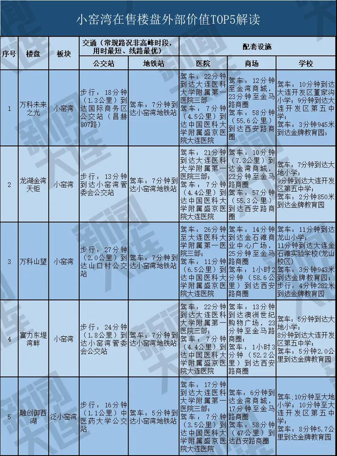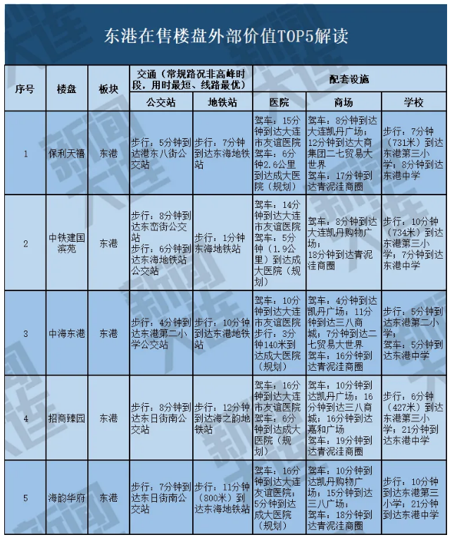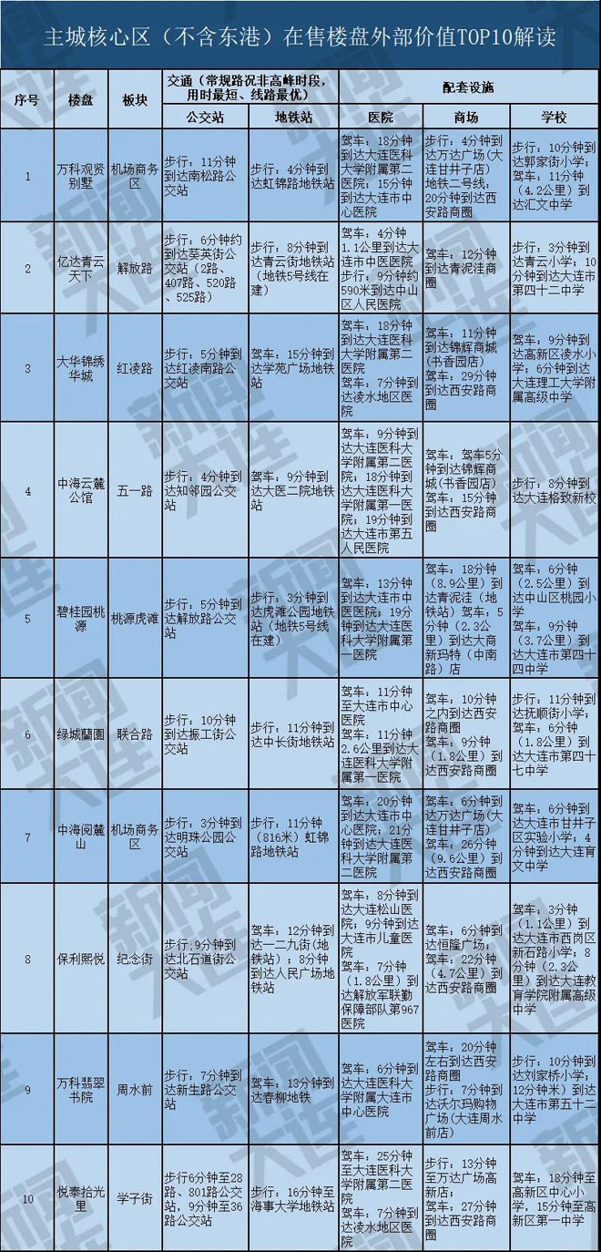 在“房住不炒”的大背景下,大连新闻传媒集团大数据在整合了地图数据、土地成交数据、区域规划数据的基础上,考察了交通、教育、商圈、医疗等自住型购房者最关注的指标,制定了评价体系,推出了“2020年热点板块在售楼盘外部价值排行榜”、“2020年热点板块在售楼盘外部价值汇总表”,直观地展现各在售楼盘当下的生活便利度和居住品质。