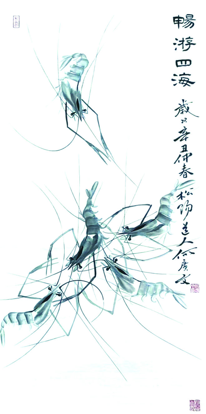 “早年,我做地毯设计工作期间,多次去鲁迅美术学院进修绘画,之后一直坚持画画。”何广文曾师从著名花鸟画家王一鸣,得到恩师的指导后,在绘画技法和心得上有很大的进步,他便一直坚持艺术创作。以画虾闻名,则是偶然。“王一鸣老师画虾也是一绝,我学到不少,在此基础上学到白石笔法,也要感谢一位作家朋友。刚开始,我的想法是,画虾可以不断练习自己在点线面多方面的绘画技巧。没想到,这位作家朋友非常喜欢我画的虾,一次他拿着我的作品,到齐白石先生的后人家里,齐老的后人看到后,对我的作品给予了肯定,还指出了一些在运笔等方面需要改进的地方。作家朋友记性好,回来后,一一回忆说给我听,我也从这些教诲和指导中听出了门道,再下笔时,感觉果然不一样了。再后来,我就迷上了画虾。”一转眼,何广文画虾有20多年了,不论到哪个国家或城市采风,他首先都要到当地集市、沟河渠道或海湾江边去观察那里的虾。