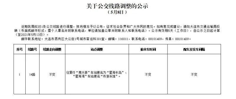 近期大连市交通运输局拟对1条公交线路进行调整,现将情况予以公布,征求社会各界和广大市民的意见。