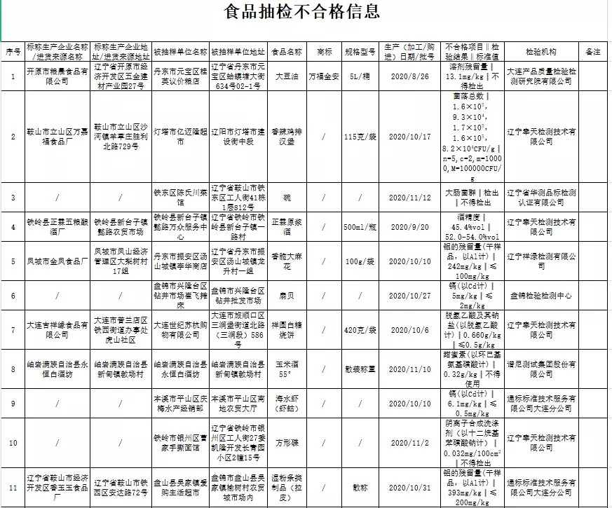盘锦市兴隆台区钻井市场崔飞摊床销售的扇贝、本溪市平山区庆梅水产经销部销售的海水虾(虾蛄)、本溪市平山区王家水产品商店销售的海水虾(虾蛄)镉超标。