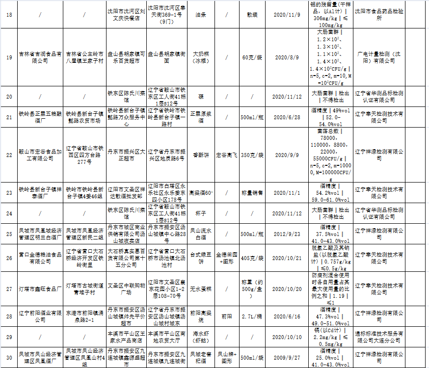 本次发现8批次白酒不合格。铁岭县正霖五粮酿酒厂生产的正霖原浆酒、凤城市乾窖酒业有限公司生产的红梅老窖酒、铁岭县新台子镇祥泰酒厂生产的散装高粱酒60°、凤城市凤凰城经济管理区明兰白酒厂生产的凤山流水白酒、辽宁前阳酒业有限公司生产的前阳高粱烧等7批次产品酒精度不合格。其中,凤城市凤山经济管理区凤凰酒厂生产的凤城老窖杞酒酒精度实测值与标签标示值差异最大,检验值为25.0%vol,标示值为42.0%vol。