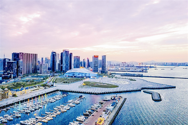 1.茫茫大海,彩云晚霞,东港商务区美景如画。
