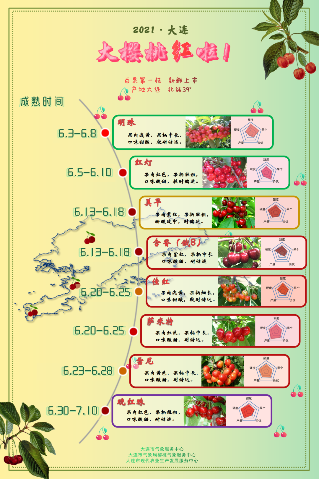 目前,正值大连露地大樱桃果实发育的关键期。今年5月全市平均气温略低,旅顺、金普新区和瓦房店等大樱桃主产区盛花期期间平均气温较去年同期低1~2℃,使得今年露地大樱桃的成熟期比去年略晚。