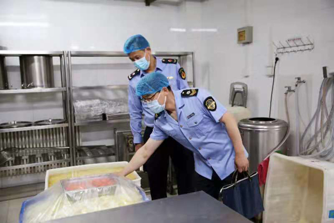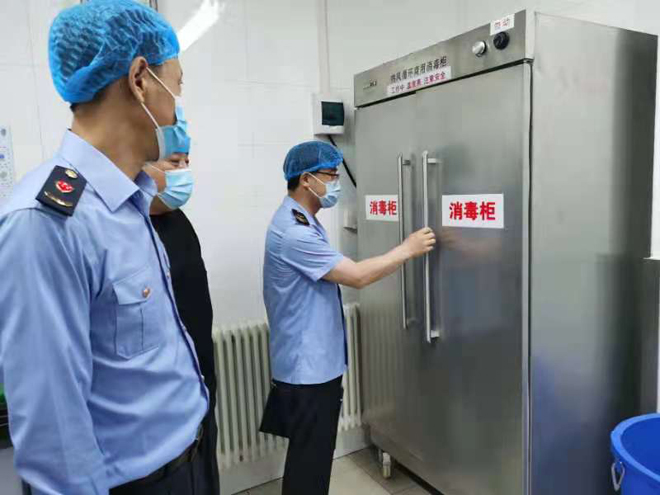 6月4日上午,大连市市场监管局和甘井子区市场监管局的检查人员来到大连市第二十高级中学食堂。高考期间,将有122名新疆班考生及200多名监考老师、保障人员在这里用餐。
