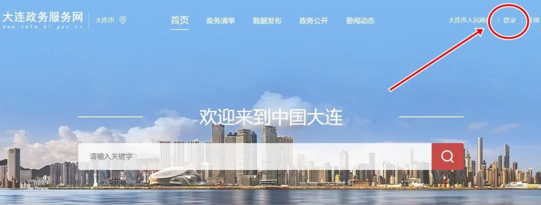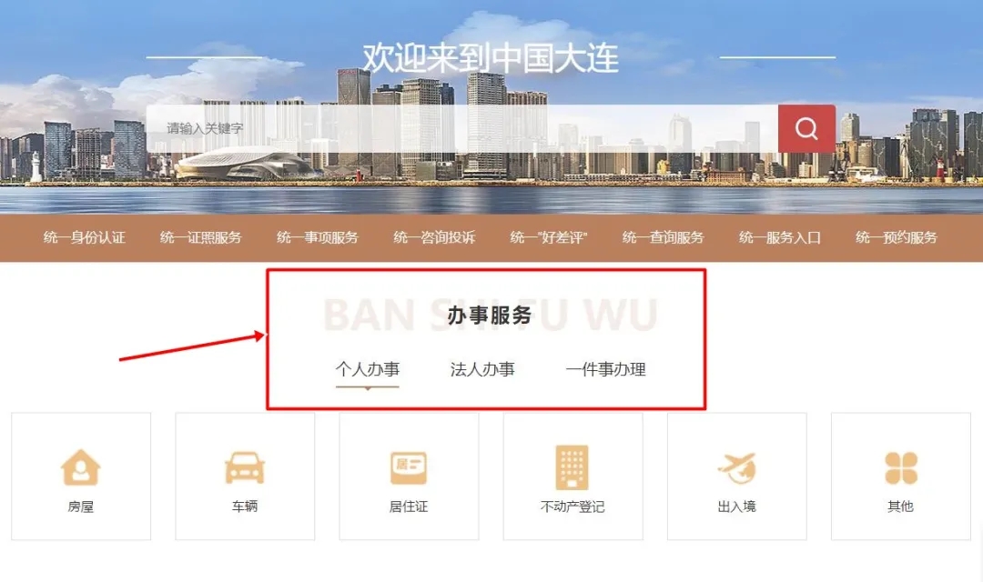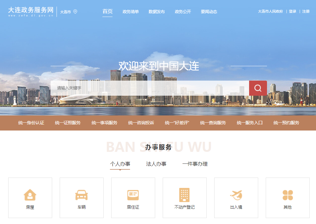 通过大连政务服务网或公积金中心网站“大连政务服务网”(图标)链接进入大连政务服务网首页;