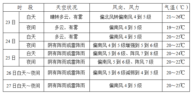 6月23日至24日白天多云,有雾;24日夜间至27日有阵雨或雷阵雨;降雨时气温略低。25日风力偏大。