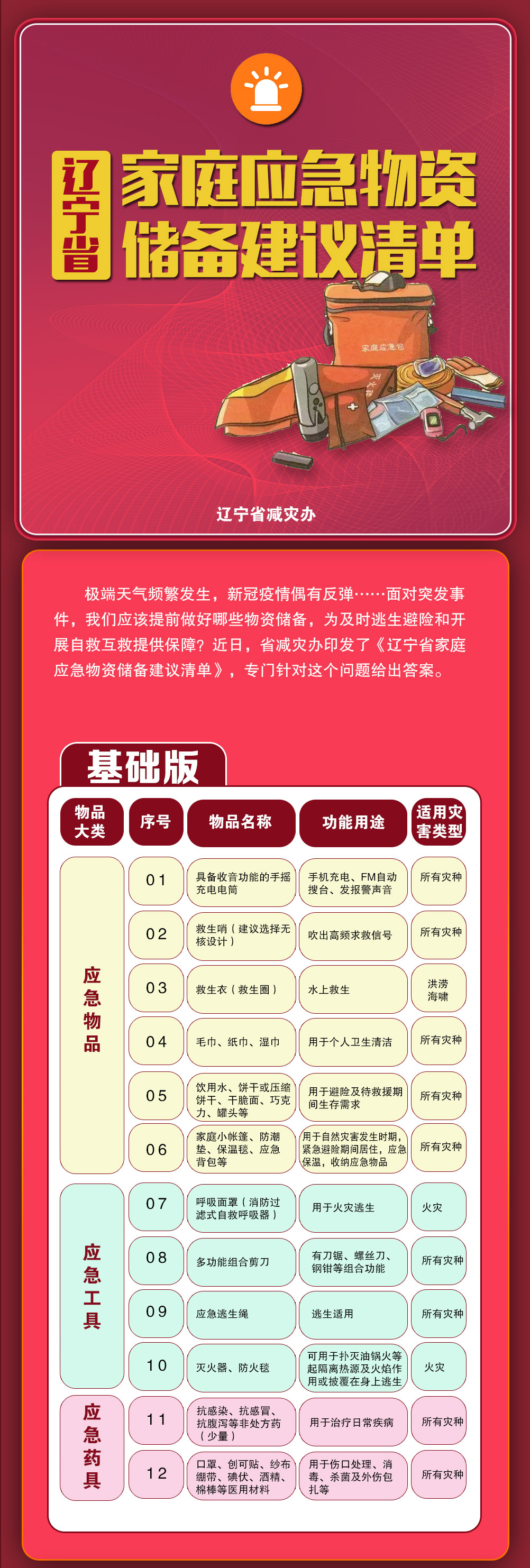 日前,省减灾办发布了一份《辽宁省家庭应急物资储备建议清单》(以下简称《建议清单》)。这是我省首次发布的官方版《建议清单》,针对性、实用性都非常强。