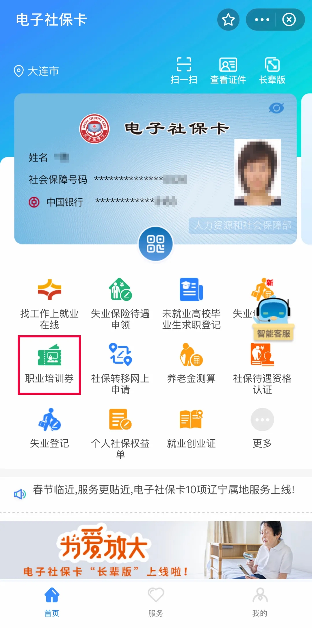 劳动者可在大连人社APP(暂不支持苹果手机IOS系统)、辽事通、电子社保卡支付宝(微信)小程序等多个电子社保卡渠道领取,领取后可报名参加职业技能培训、自主选择培训项目和培训机构。