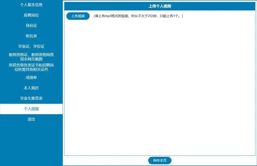 综合评价满分为100分,包括“基础评分”满分50分(根据考生上传成绩、荣誉等资料进行打分)、“面谈评分”满分50分(考官根据考生上传的答题视频进行打分)。面谈题目:我竞聘本岗位的优势。考生根据上述题目录制2分钟视频,8月20日18:00前通过报名平台http://jpjszp.fanedu.net上传。视频格式为mp4,大小不超过100MB,视频只能上传1个。上传视频可以在线预览,如再次上传,则替换原视频。报名平台界面如下: