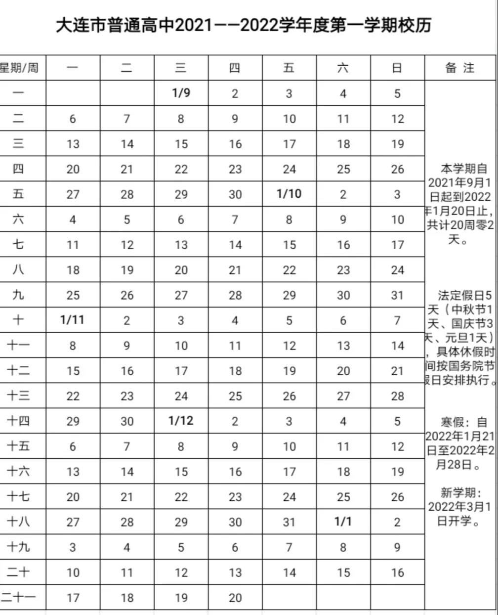 9月1日,大连市教育局发布大连市普通高中2021-2022学年度第一学期校历,其中还公布了寒假放假时间及下学期开学时间。