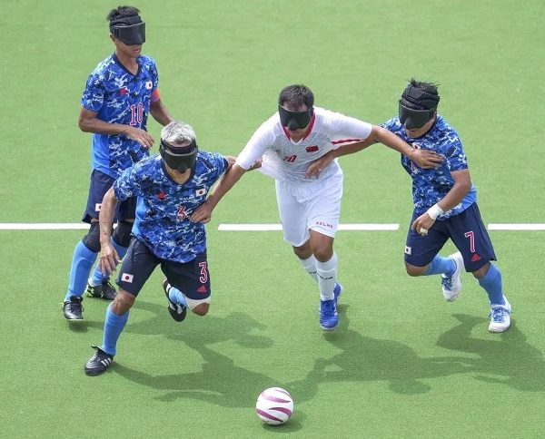 盲人足球运动起源于20世纪80年代的西班牙。盲人足球为5人制运动,守门员由正常人担任,场上四名运动员为全盲。场地周边有围墙遮挡,比赛用球里边放了“铃铛”,滚动起来会有声音,运动员通过声音辨别方向来运球和传球。同时,队员与队员之间也主要靠声音以及默契,来进行球的传递。除了跟着足球的声音跑动之外,队员还要随时听指令,守门员安排防守。教练则站在球门处指挥运球进攻,通过鼓掌或者敲击门杠提醒射门。所以,盲人足球对运动员的定位能力、平衡感和协调性要求都很高。因为运动员们奔跑的速度快,更容易发生激烈的肢体冲撞。盲人男子足球项目是在 2004 年正式进入残奥会的。