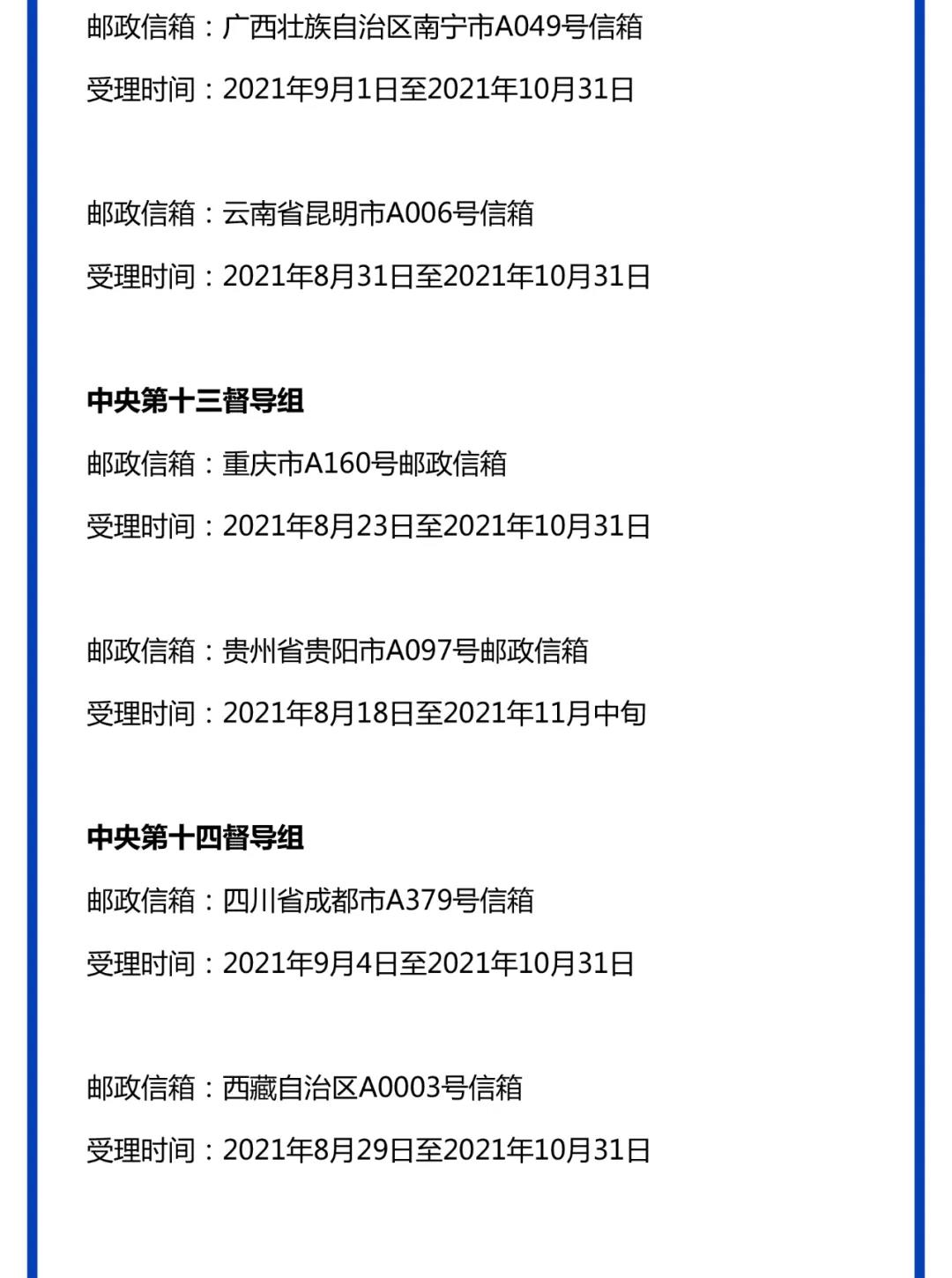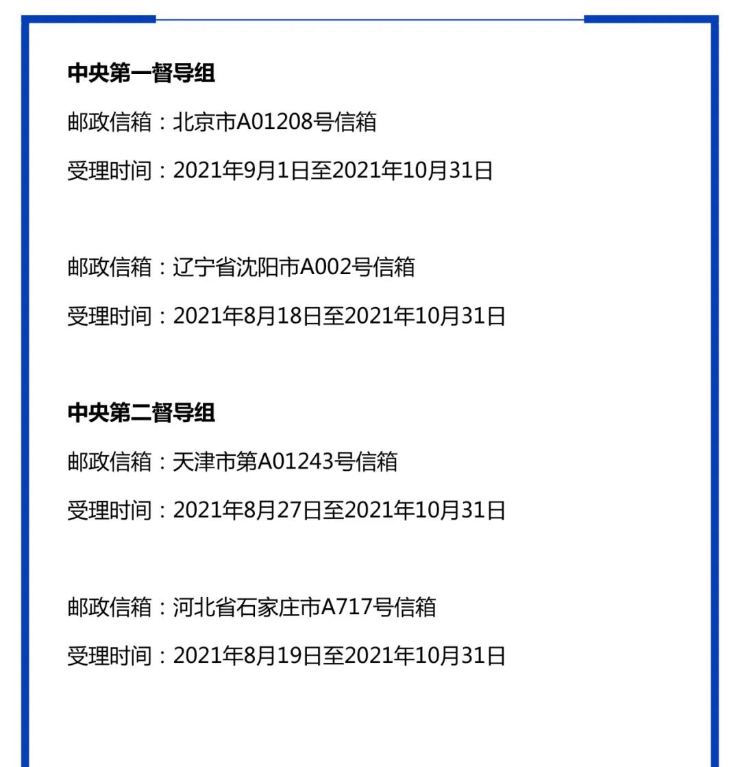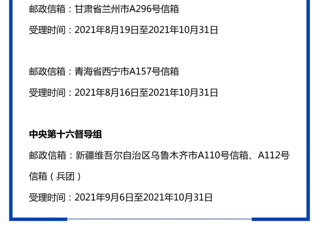16个中央督导组进一步畅通线索举报渠道,扩大了线索来源,进驻期间,在31个省(区、市)开设专门邮政信箱,受理群众举报!目前,16个中央督导组已全部发布了设立举报信箱的公告。
