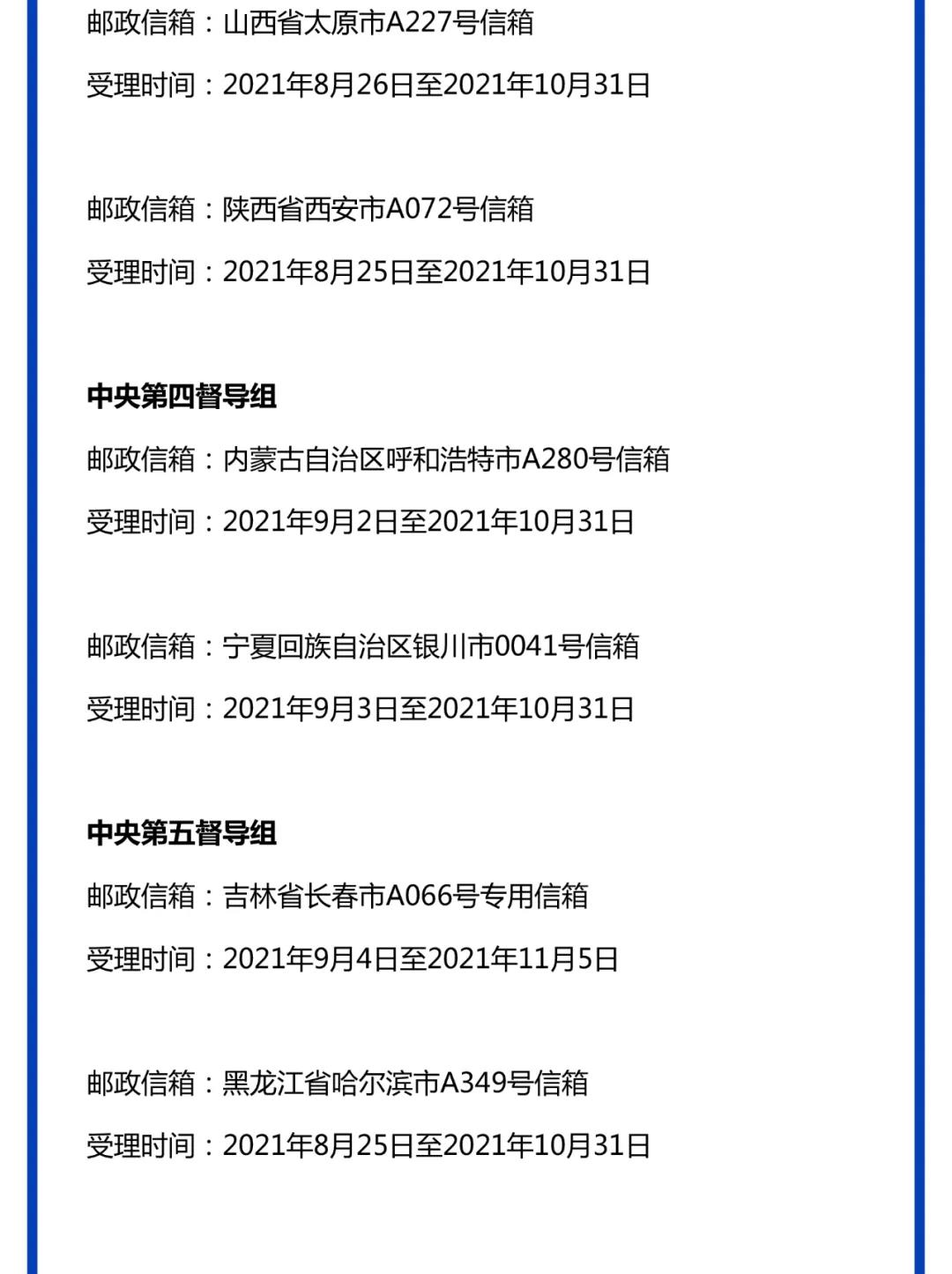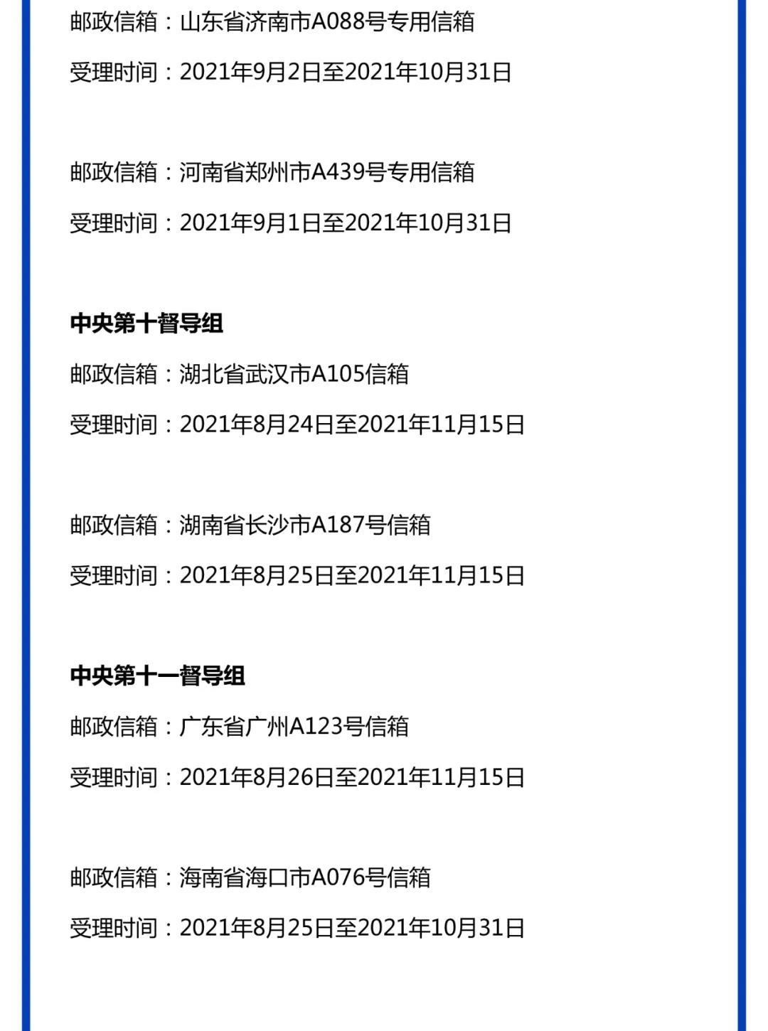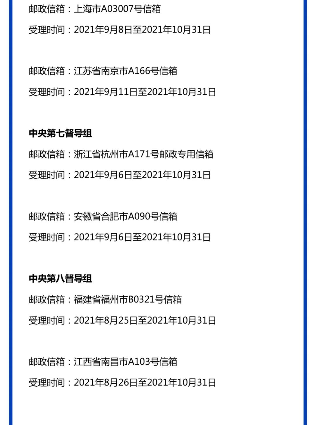 16个中央督导组进一步畅通线索举报渠道,扩大了线索来源,进驻期间,在31个省(区、市)开设专门邮政信箱,受理群众举报!目前,16个中央督导组已全部发布了设立举报信箱的公告。