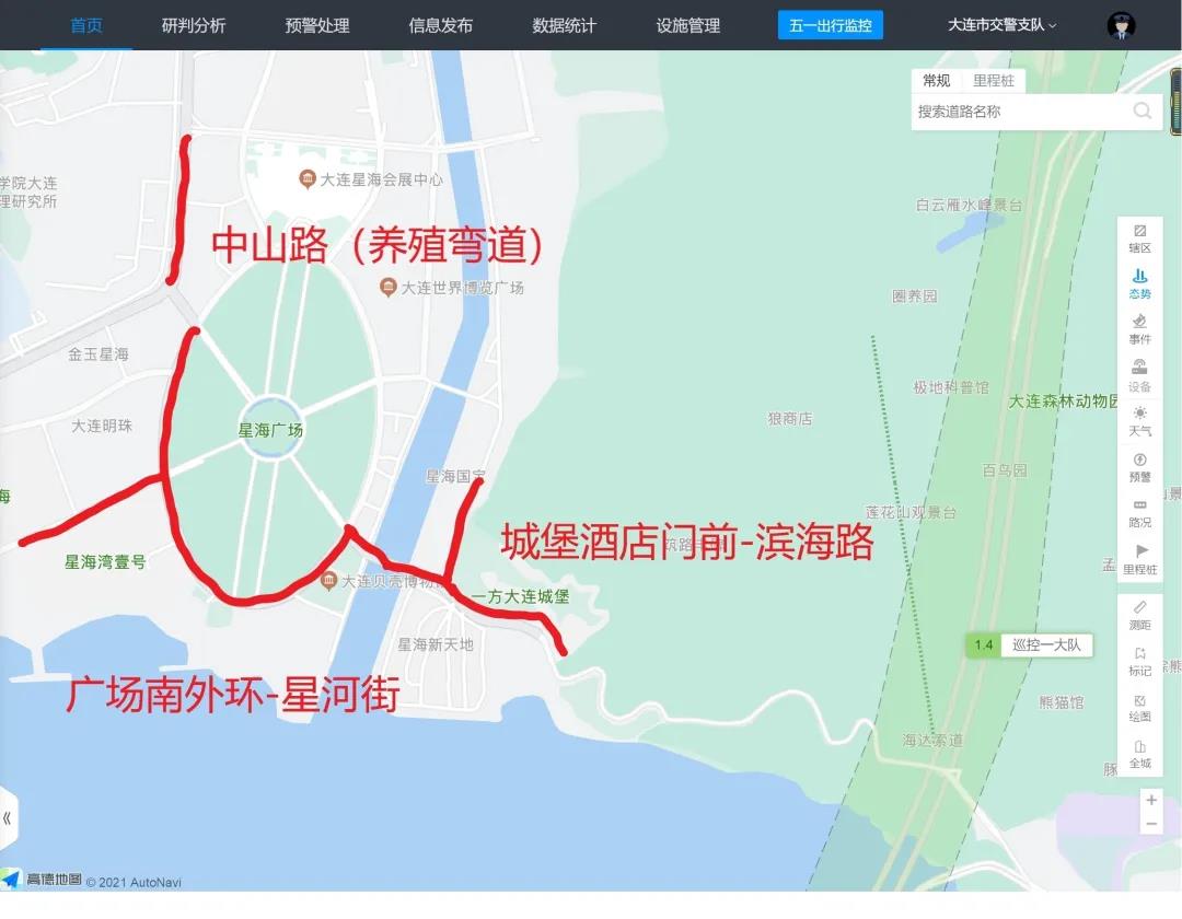 滨海路西段——傅家庄至星海城堡。森林动物园上下游一公里范围内车流将集中饱和,预计10月2日至5日(除雨天)10时-14时为观光游览集中时段,人流、车流将于日内9时开始快速增长,17时后逐渐恢复正常。