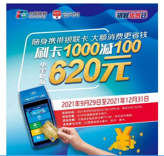 十一优惠大手笔!用银联卡满1000最高豪减620
