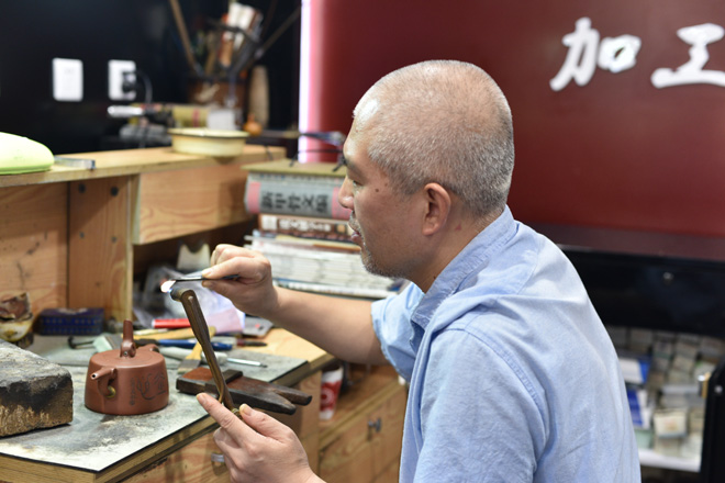 中国当代艺术家、福娃之父韩美林入室弟子、国家级工艺美术师王志刚曾专程带着韩美林创作的一批紫砂壶作品赶到大连,请一位金工师傅帮忙为其中几把不慎破损的紫砂壶做修复,看到修复后的紫砂壶后,王志刚感慨:“在这个一味讲求速效的现代社会里,能够看到一个人30余年始终践行着金工匠人的精神、观念与做法,着实令人万分惊艳。”王志刚说的金工匠人就是51岁何国涛,9月28日,记者走进了他“别有洞天”的那一隅金石世界。