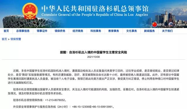 驻洛杉矶总领馆提醒出国留学人员提高安全意识,关注出入境时可能遇到的风险,加强防范,妥善应对。自洛杉矶出入境的中国留学生如遇紧急情况,请及时联系驻洛杉矶总领馆寻求协助。