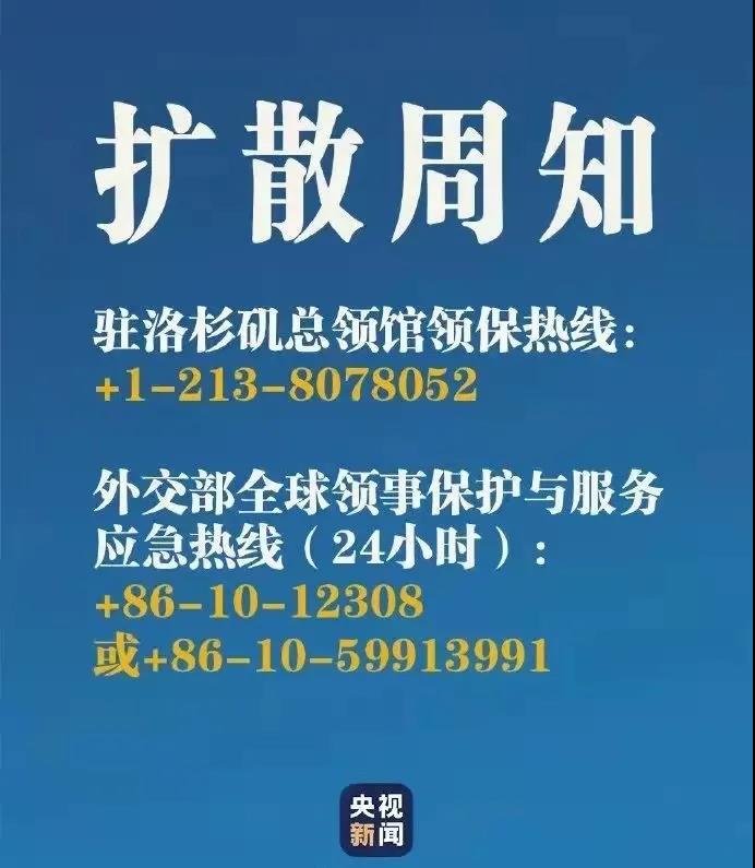 驻洛杉矶总领馆领保热线:+1-213-8078052。