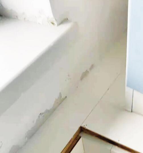 10月9日,马女士家的北卧室还保持着被淹过的模样。北侧的飘窗壁纸被渗水泡开,霉斑如同一朵朵“小蘑菇”。临窗的榻榻米被水淹过,仍有霉味未散。木板浸泡受潮后,已经开裂变形,无法复位了。在窗缝和墙壁边缘,漏雨水浸的痕迹都清晰可见。
