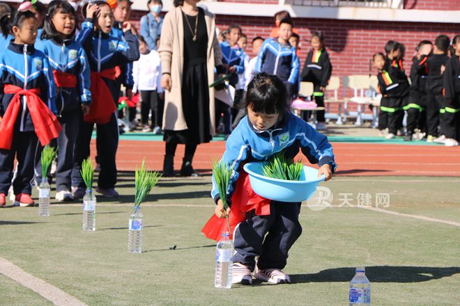 这场趣味娱乐运动会的项目依托农民生产加工等劳动环节进行科学设计,以趣味性与劳动实践相结合,同学们化身农民,在娱乐运动中大展身手。“插秧我最快”“抗旱运水护苗赛”通过竞技的形式让学生体验到播种的艰辛,“跨越障碍摘苹果”“运送粮食”“颗粒归仓”的游戏过程则充满丰收的喜悦;拔萝卜形式的拔河比赛让学生体验团结一心、颗粒必收的决心;“快乐农夫”和“我是小巧手”让学生体会制做美食的过程。劳动运动会的过程将各种劳动体验项目集中进行,内容丰富,学生的体验过程充满了乐趣和收获。通过活动,学生们深刻体会对收获的珍视,是对“粒粒皆辛苦”的敬意。培养学生从小养成勤俭节约的好习惯。