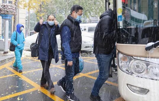 11月8日早上8点,大连的第一场雪丝毫没有要停下来的意思,路上泥水与雪水横流。此时,大连市友谊医院110名医护人员已顶风冒雪分头出发,前往甘井子区和高新园区开展核酸采集工作。