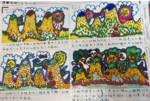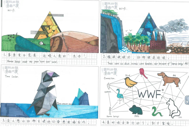 一次妈妈带我去古生物博物馆,我了解到很多生物已经灭绝,但是一些化石证明它们存在过,于是我画的第一图里面生物种类很多,采用多色绘画,用丰富的色彩映衬生物多样。第二图,现在各领域飞速发展的时代,高楼遍地,不免多了砍伐、尾气,很多动物也被圈养失去自由。第三图,人们已经意识到环境破坏给生物带来的危害 ,开始通过各种方式治理,画了我想象的海洋治理机。最后一图,我通过想象,在未来超科技时代,创造出更加环保的太阳能海陆空三栖交通工具,还有仿生动物。