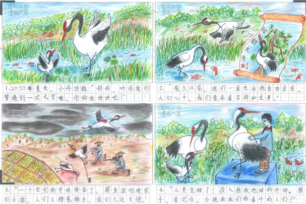 我听过的《丹顶鹤的故事》,是一个真实的故事,讲述了一个叫徐秀娟的姐姐,为了保护濒临灭绝的丹顶鹤,献出自己生命,听这个故事时,我热泪盈眶,难以忘怀。所以我选用了丹顶鹤,作为这幅漫画中的主角,表示了我徐秀娟姐姐深深地怀念。