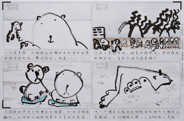 通过这幅漫画,我想告诉人类,北极熊的殇离我们不远了。珍爱我们赖以生存的大自然,愿不久的将来,包括北极熊在内的世界万物都能幸福的生活在地球这个大家园里。