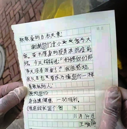 天健网消息(大连新闻传媒集团记者 毛雪梅)“请您给我签个名吧,我长大后也要成为像您们一样勇敢的人。”11月15日,在庄河水仙富力社区外采的大连大学附属中山医院的大白们工作时收到一位8岁男孩塞过来的纸条,歪歪扭扭的字里行间,写满是对医护的崇敬和感谢。